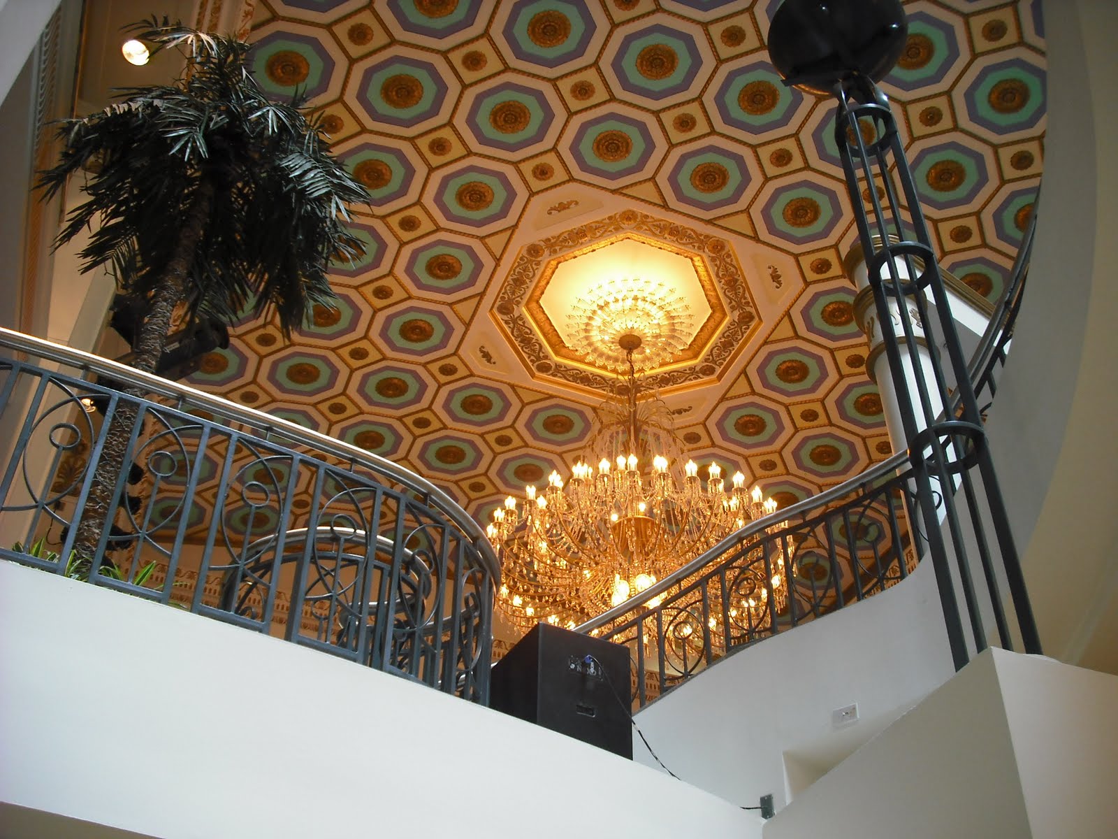 Notice how I'm standing in the middle of the street like a dork when taking the pic. Also notice how I'm unable to hold the camera straight when taking the pic, giving you further evidence of my vastly superior intaligense. We paid a quick visit to a little shopping mall and, for whatever reason, they had a beautiful ceiling with a, pardon my French, big ass chandelier: